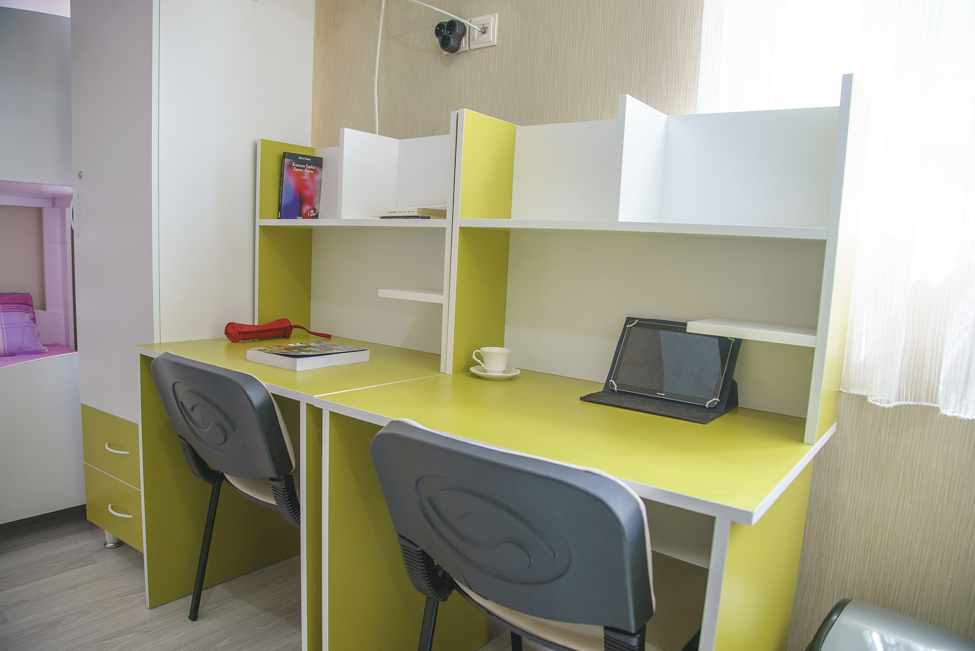 • Ergonomik Mobilyalar: Her öğrenci için ayrı çalışma masası, sandalye ve kitaplık gibi ergonomik mobilyalar ile donatılmıştır.